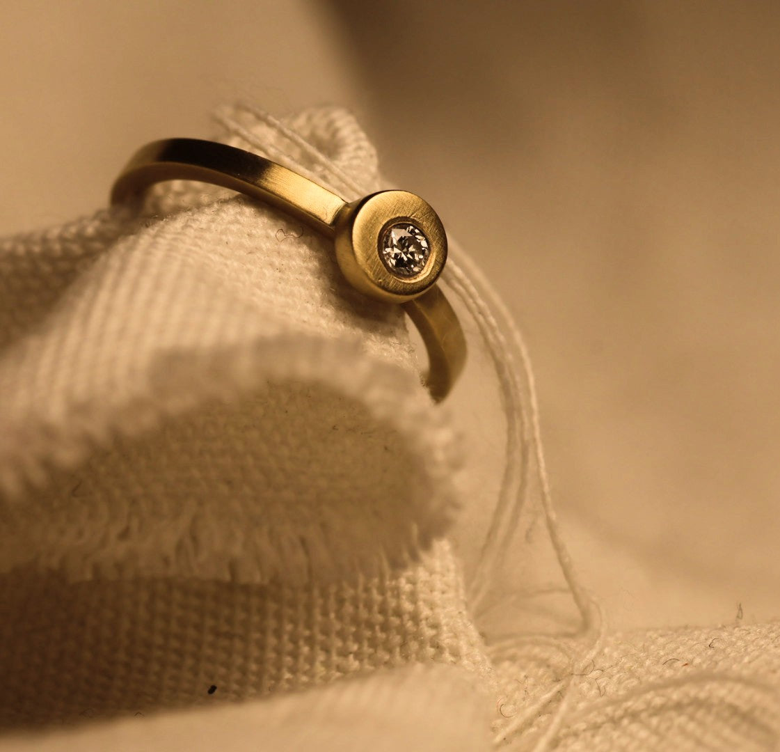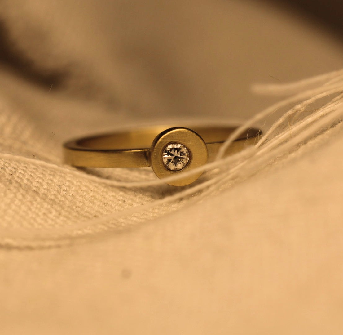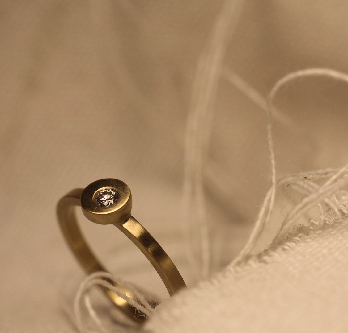 Deze verfijnde verlovingsring in 18 karaat goud belichaamt tijdloze eenvoud met een moderne twist. De subtiel uit het midden geplaatste natuurlijke diamant zorgt voor een verrassend speels accent – perfect voor wie houdt van ingetogen elegantie met een eigentijdse uitstraling.