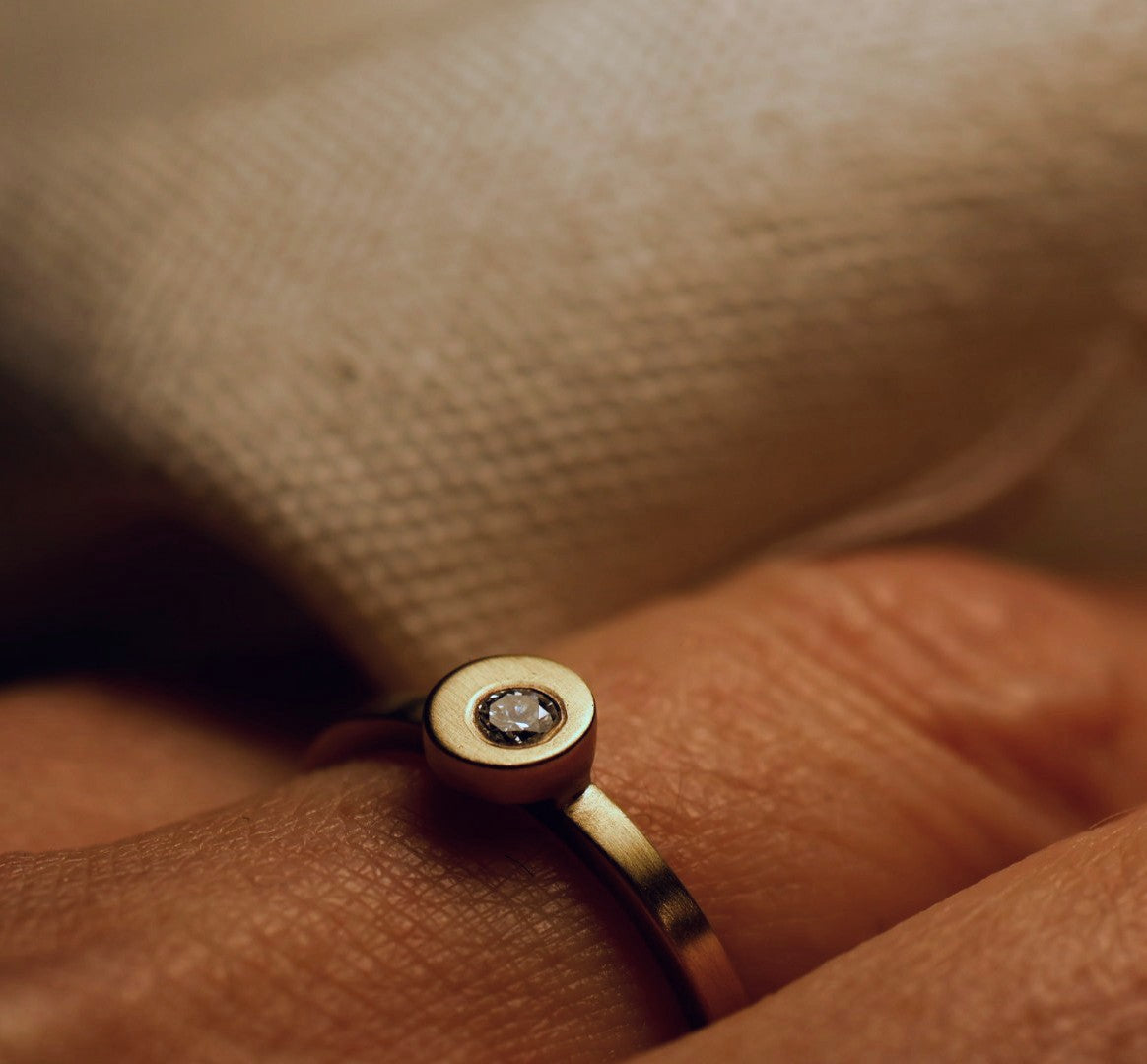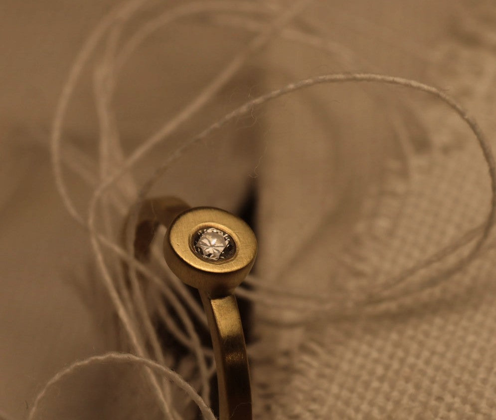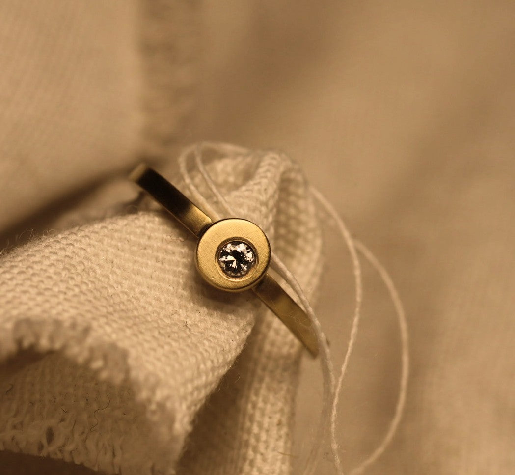 Deze verfijnde verlovingsring in 18 karaat goud belichaamt tijdloze eenvoud met een moderne twist. De subtiel uit het midden geplaatste natuurlijke diamant zorgt voor een verrassend speels accent – perfect voor wie houdt van ingetogen elegantie met een eigentijdse uitstraling.