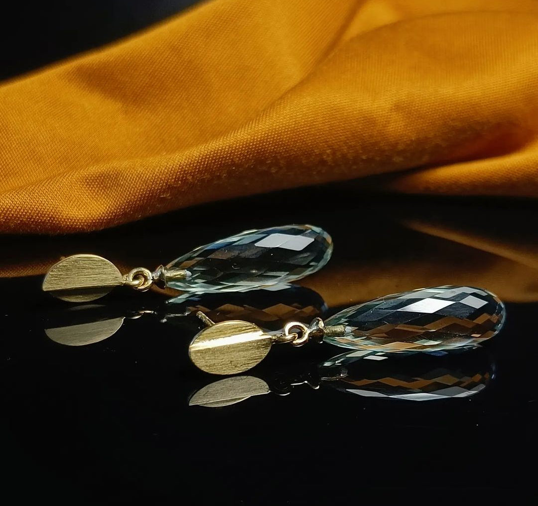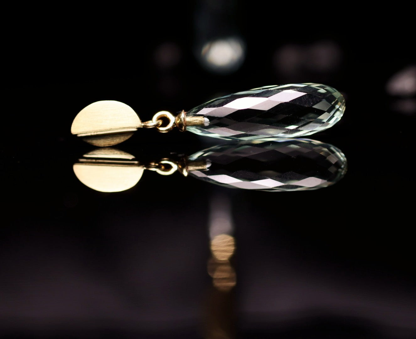 These refined chandelier earrings feature a faceted prasiolite drop suspended from a sculptural 18K gold-plated stud. The sleek, folded design at the top enhances the romantic green hue of the stone, making them a timeless statement piece. A simple, elegant pairing of modern lines and subtle green sparkle.