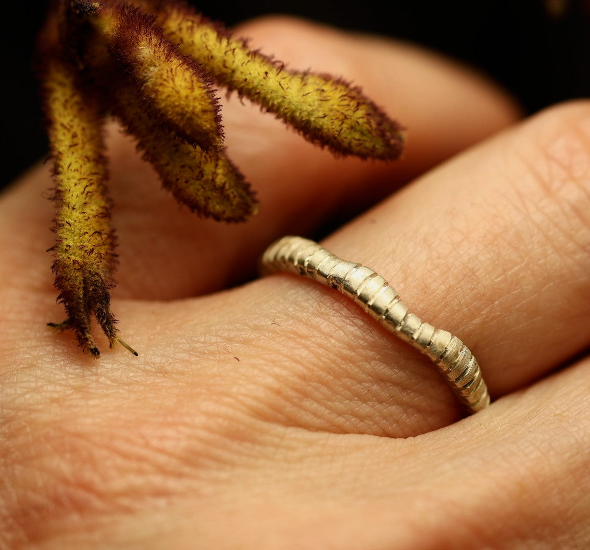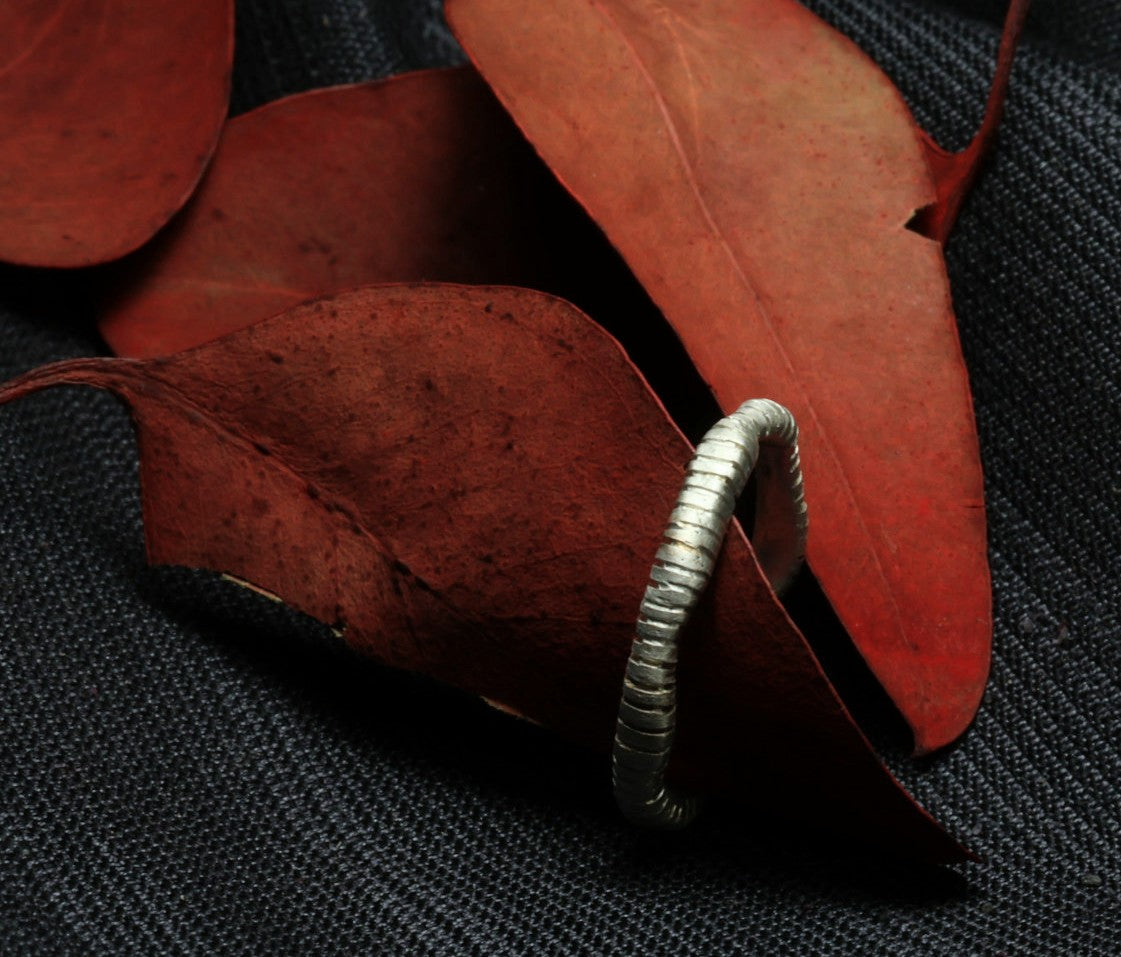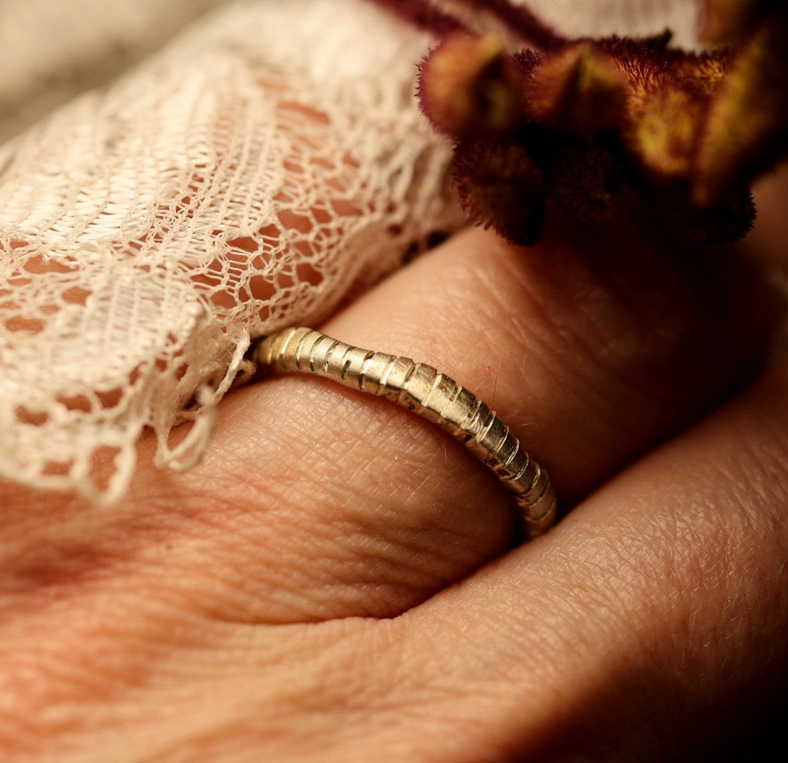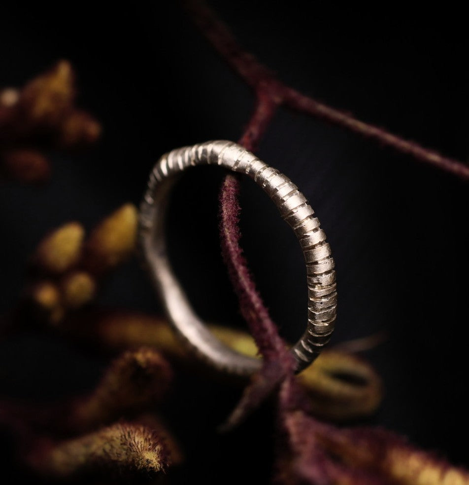 A slim, minimalist band in gold or silver.