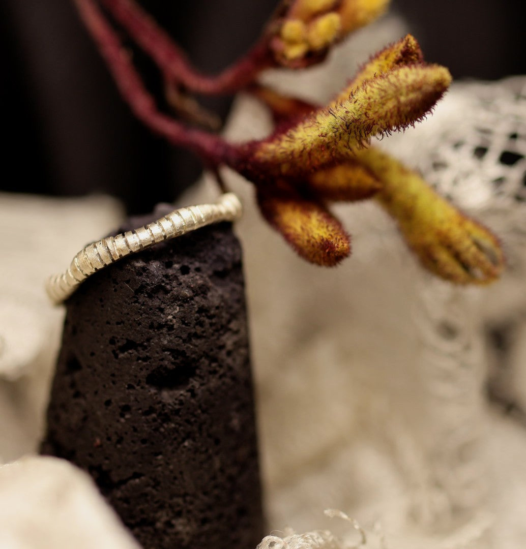 It has a distinctive textured surface with evenly spaced horizontal ridges running all the way around, giving it a subtle, handcrafted look.