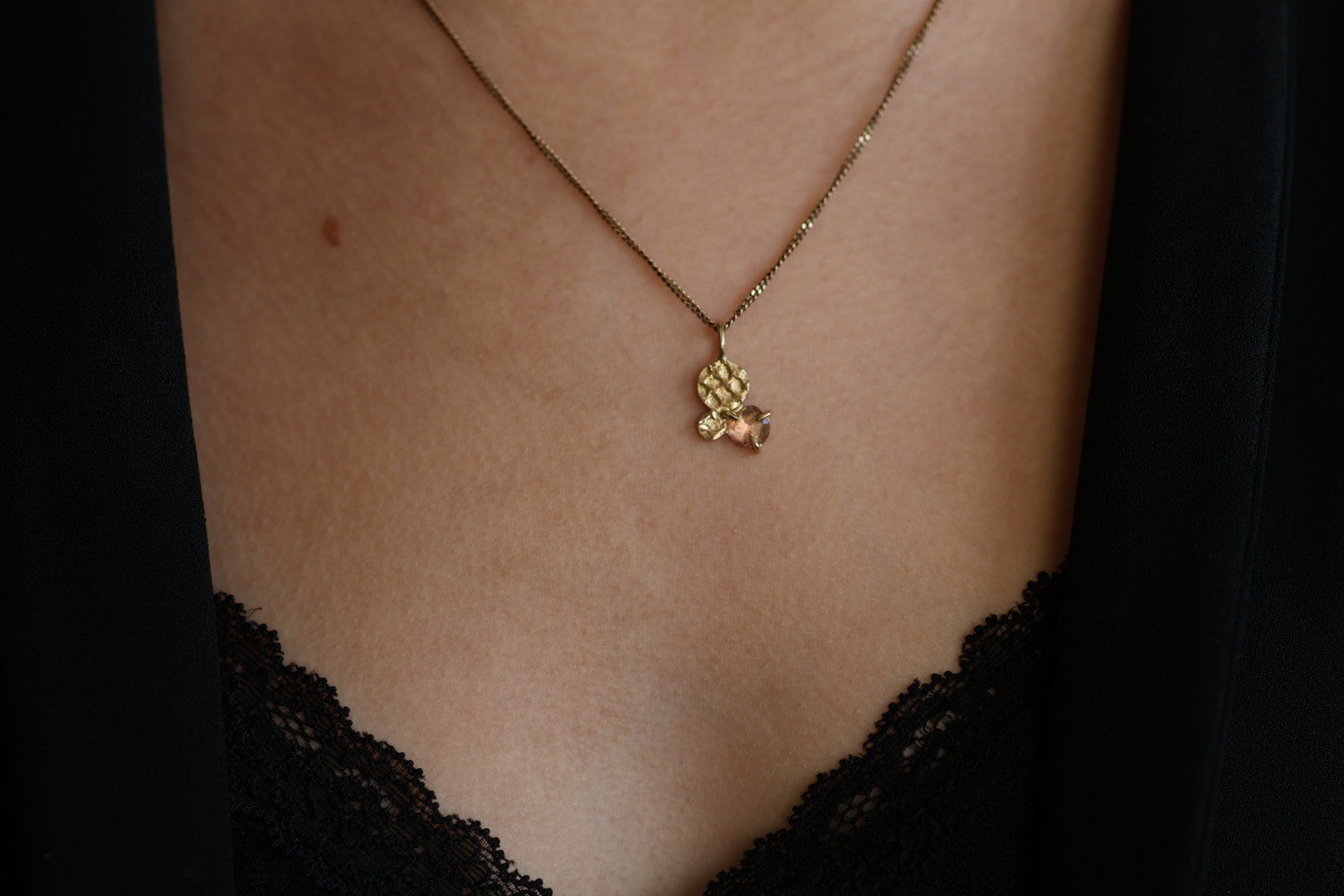 A one-of-a-kind 18-karat gold pendant weaves itself around a pink tourmaline, embracing it like a spider capturing a glimmering jewel. The lace-textured gold glows with a soft, welcoming warmth.