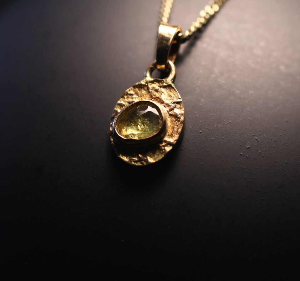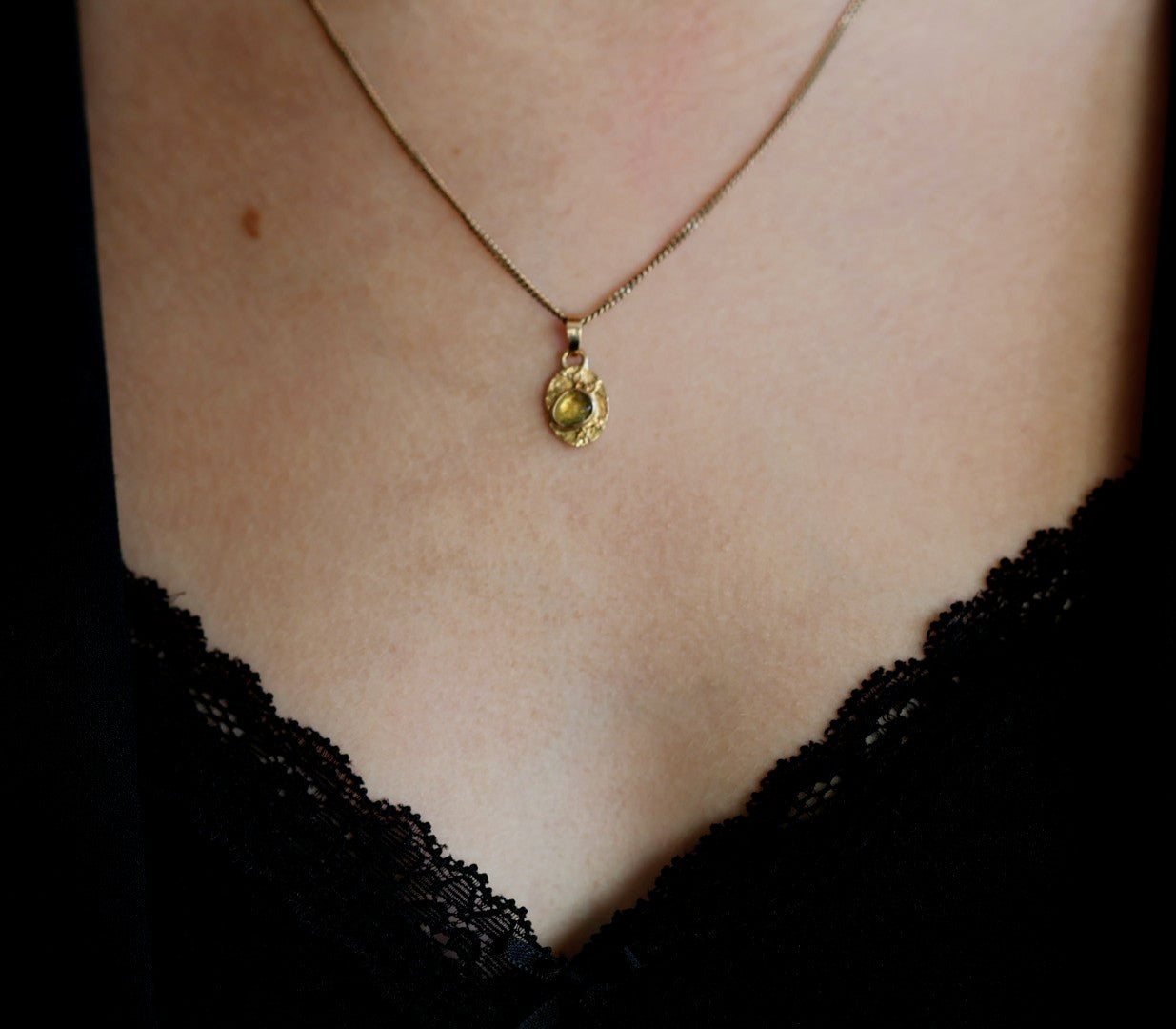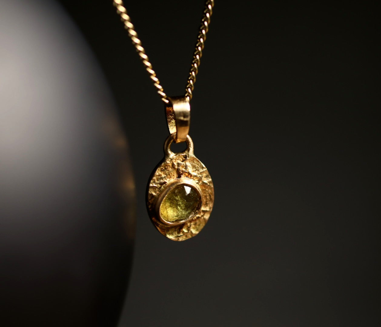 An exquisite 18K golden oval pendant adorned with intricate lace detailing, centered by a luminous cabochon-cut green tourmaline. A modern, streamlined silhouette enriched with a whisper of green.